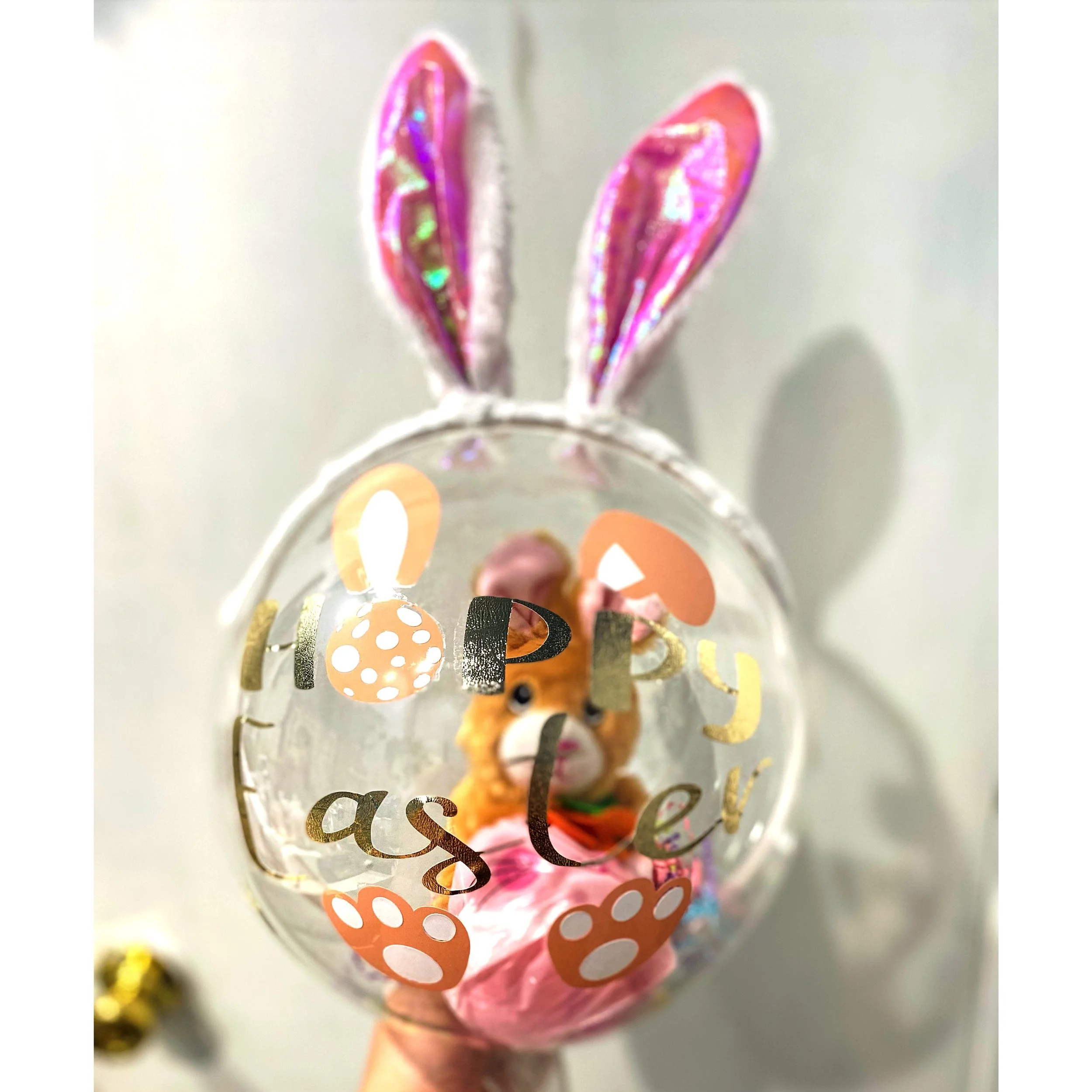 Contains: • 1 plush bunny ear(pink/blue/yellow) • 1 plush animal (pink bunny/brown bunny/lamb/duck) •1 bunny sack of candy filled eggs •5 sugar cookies (2 bunnies & 3 eggs) •color vinyl blue/pink bunny available •default font gold texture