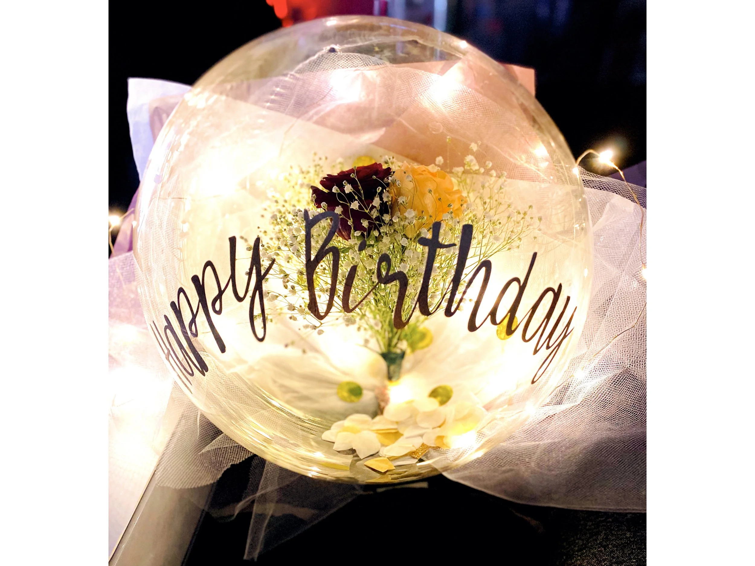 Starting @ $45 comes with 3 roses, baby’s breath, wrapping, custom vinyl text gold foil, wrapped, and comes with lights.
